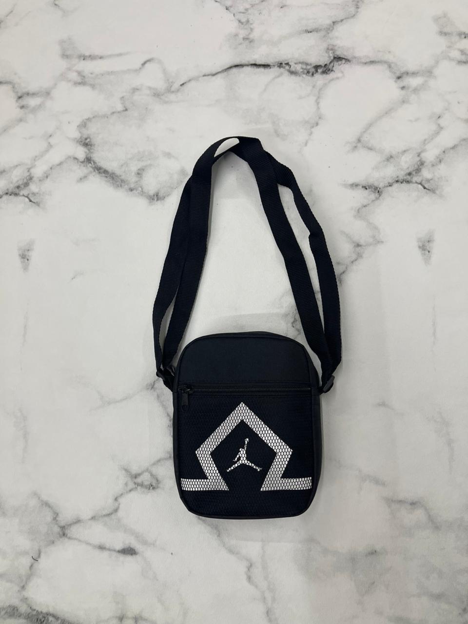 Morral Jordan negro con diseño reflectivo y logo Jumpman. Elegancia deportiva en un formato práctico.