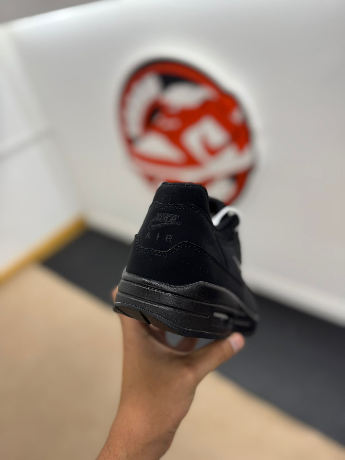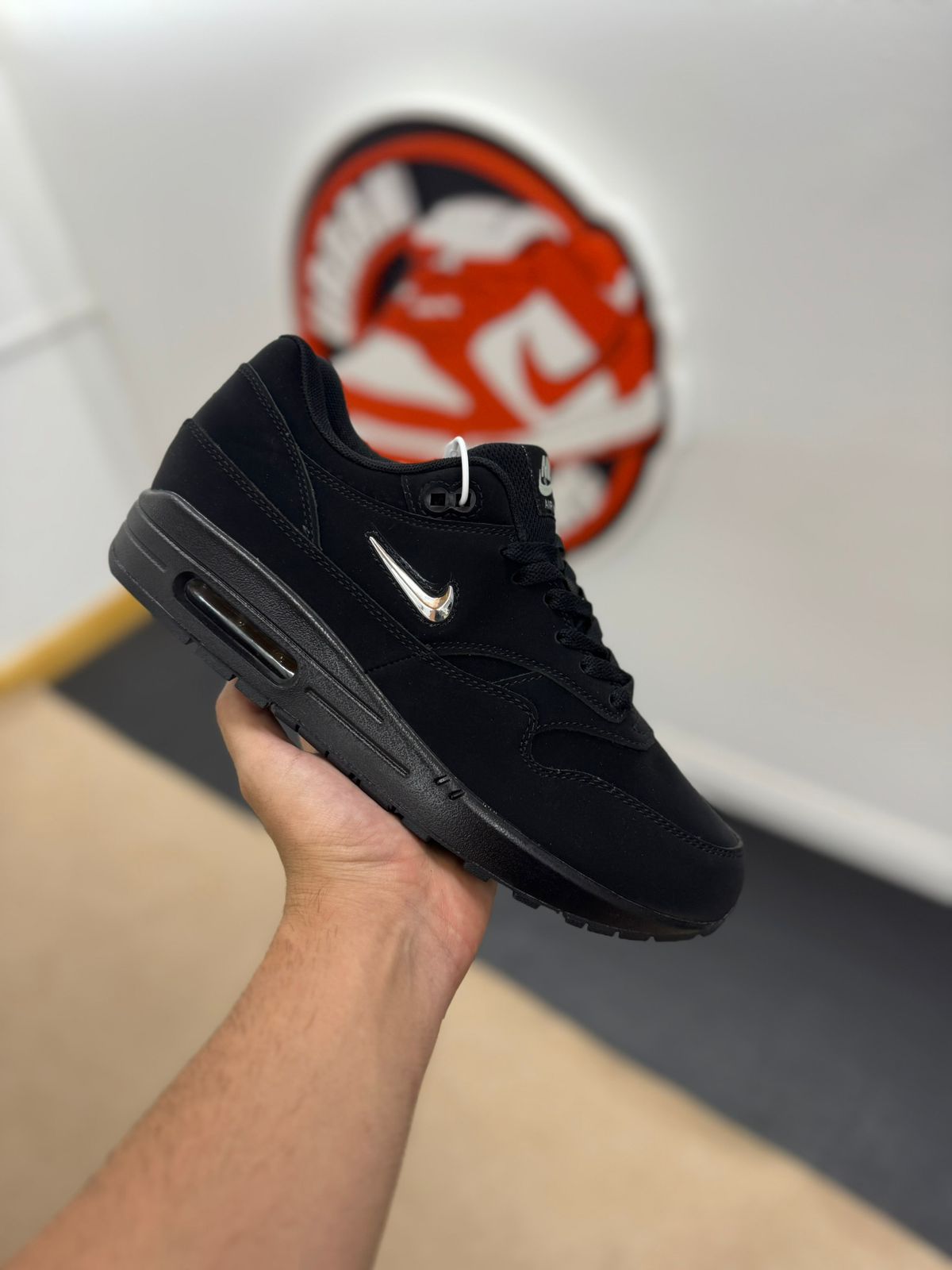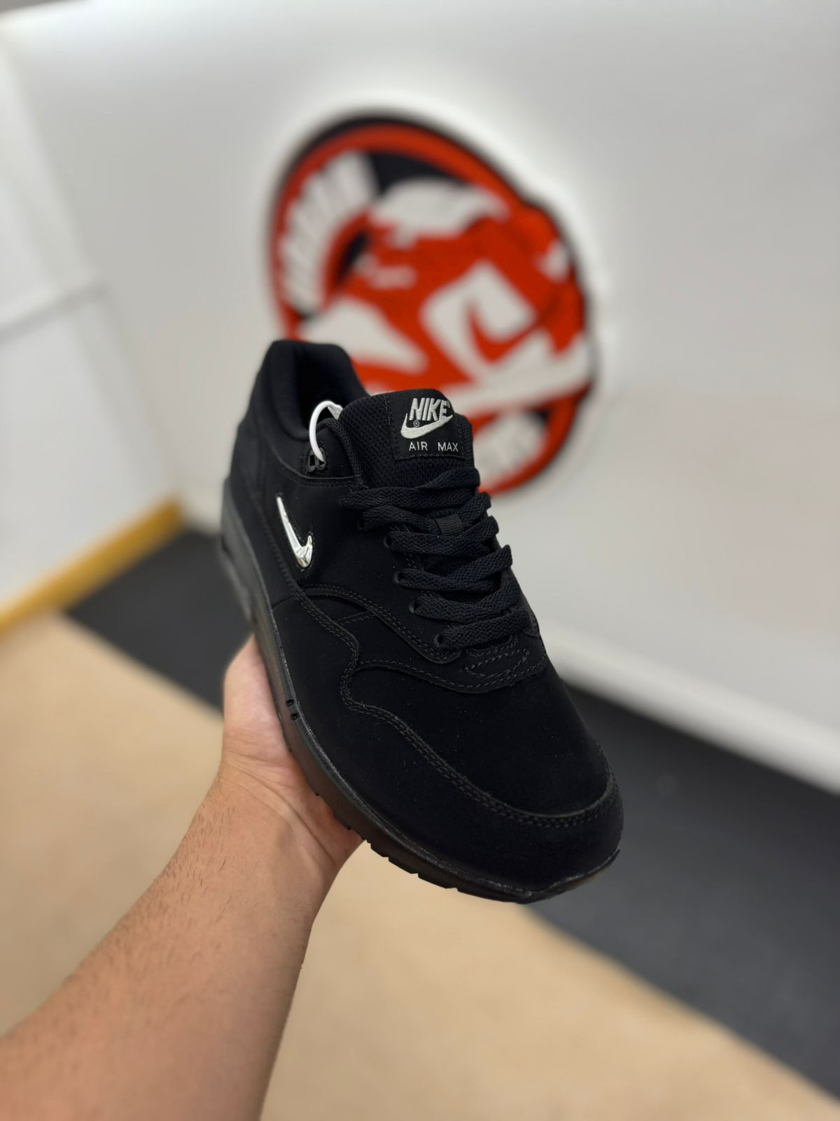 Esta zapatilla es una réplica del modelo Nike Air Max 1. Imita un diseño elegante que combina una parte superior en material sintético blanco con un guardabarros de material tipo gamuza negra. El detalle más distintivo es la imitación del “Jewel Swoosh” (logo pequeño) en un acabado dorado metálico, sobre una suela de color goma.